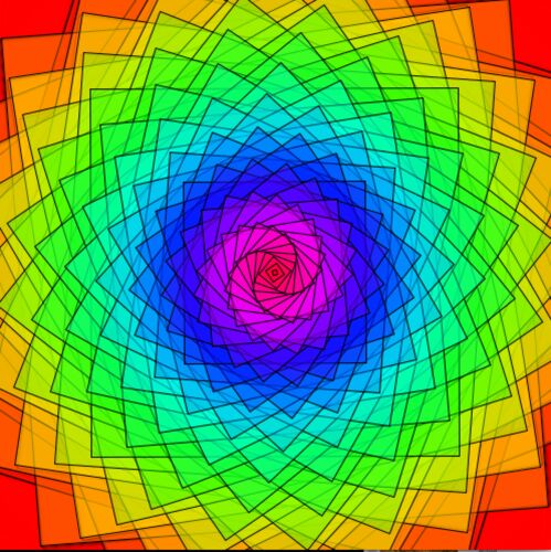 虹色の四角を何重にも描いて、回転をすることで良い感じになりました。 やってることはよくある回転ですが、何回見ても綺麗ですね。 float seed[]=new float[250]; void setup(){ size(500,500); colorMode(HSB,360,255,255); for(int i=0;i